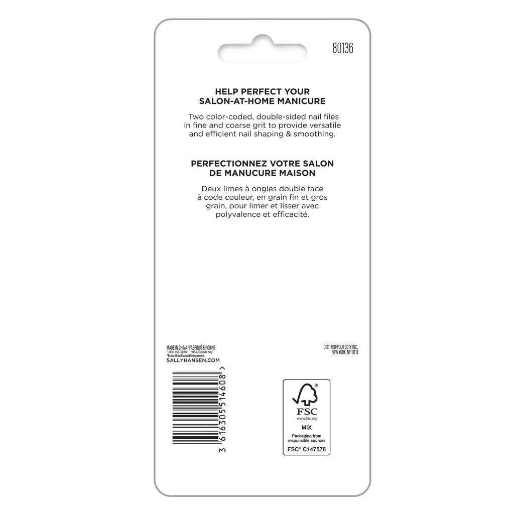Two color-coded, double-sided nail files in fine and coarse grit to provide versatile and efficient nail shaping & smoothing.