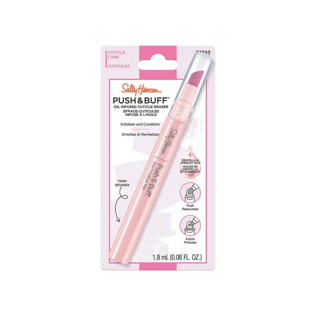 Condition and exfoliate cuticles in 1 step with NEW Sally Hansen Push & Buff Oil Infused Cuticle Eraser! Infused Cuticle Eraser Infused with Centella, Sweet Almond and Apricot oils, the ceramic tip gently polishes to remove excess cuticles while leaving nail beds refreshed.