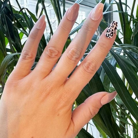 Augmentez le glamour avec des ongles courts en forme de cercueil, avec une base nude éblouissante, un imprimé animal féroce et une touche de paillettes pour éblouir. C'est la combinaison parfaite entre le sauvage et le fantaisiste !